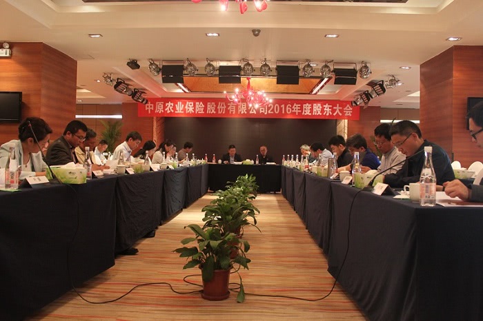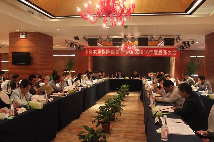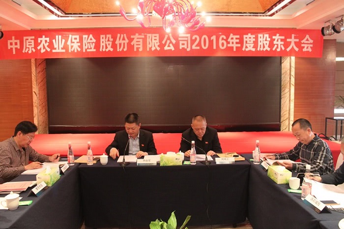 中原农业保险股份有限公司2016年度股东大会于 2017 年4月28日在郑州市美豪诺富特酒店成功召开。会议由公司董事长毕治军主持,17家股东单位派均代表出席会议,监事长刘颂正、总裁姜华参加会议。董事会秘书李万峰、总裁助理叶强分别汇报了相关议题。会议全部议题均顺利通过。