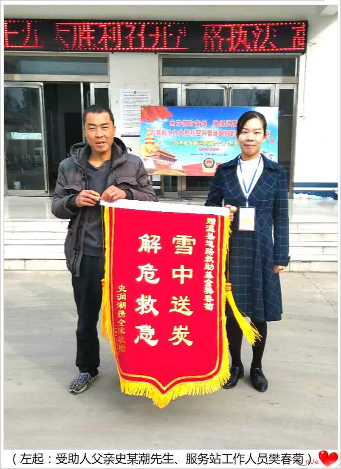 小史的父亲史某潮先生为表达感激之情,特送锦旗以表谢意。史先生说:“感谢道路救助基金,让我儿子及时获得医治,虽然司机肇事逃逸没有破案,但救助基金的出现让我儿子不会因为交不上抢救费而耽误病情,我代表全家感谢你们。”