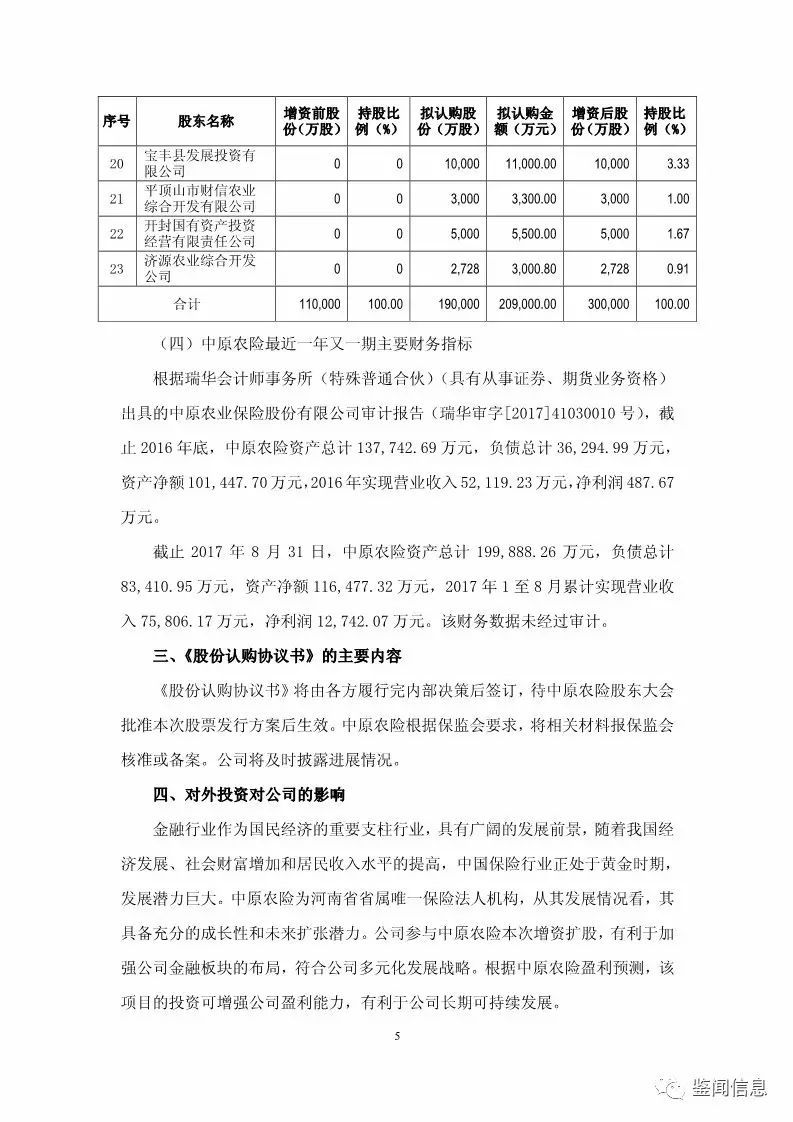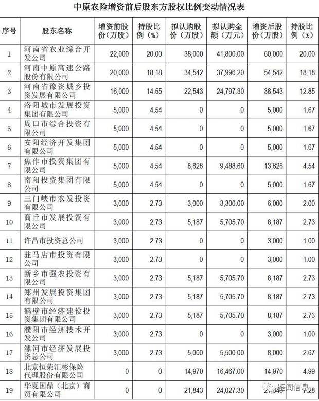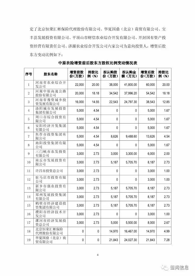 公告显示,根据评估结果,经河南省公共资源交易中心通过公开发行认购程序,初步确定了北京恒荣汇彬保险代理股份有限公司、华夏国鼎(北京)商贸有限公司、宝丰县发展投资有限公司、平顶山市财信农业综合开发有限公司、开封国有资产投资经营有限责任公司、济源农业综合开发公司六家公司为意向投资人,增资后股东方变动比例如下:
