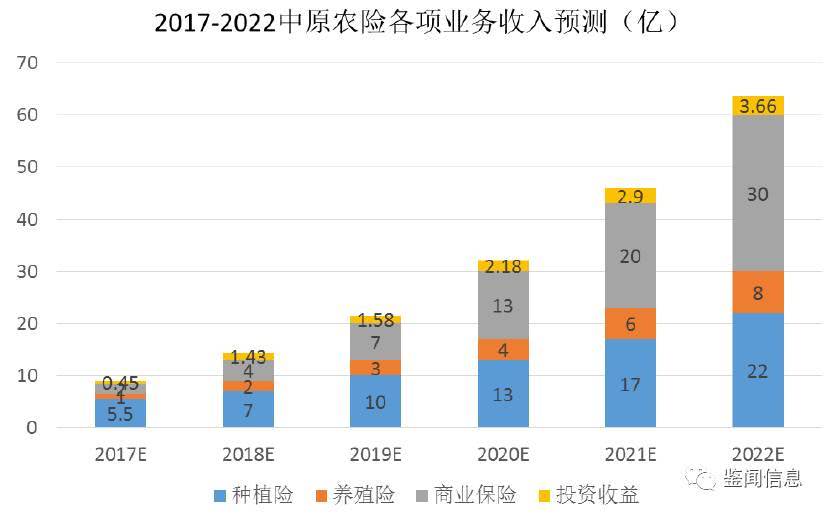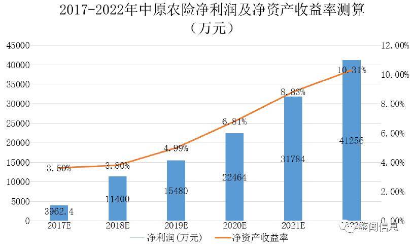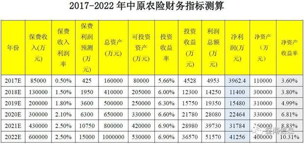 同时,在“中原农业保险股份有限公司增资扩股项目可行性研究报告”中,还对中原农险财务未来经营数据进行预测,经营数据预测实现年均增长50%以上,2020年最低达到30亿保费收入。按照到2022年,中原农险实现保费收入60亿的发展目标进行测算,各项指标测算如下: