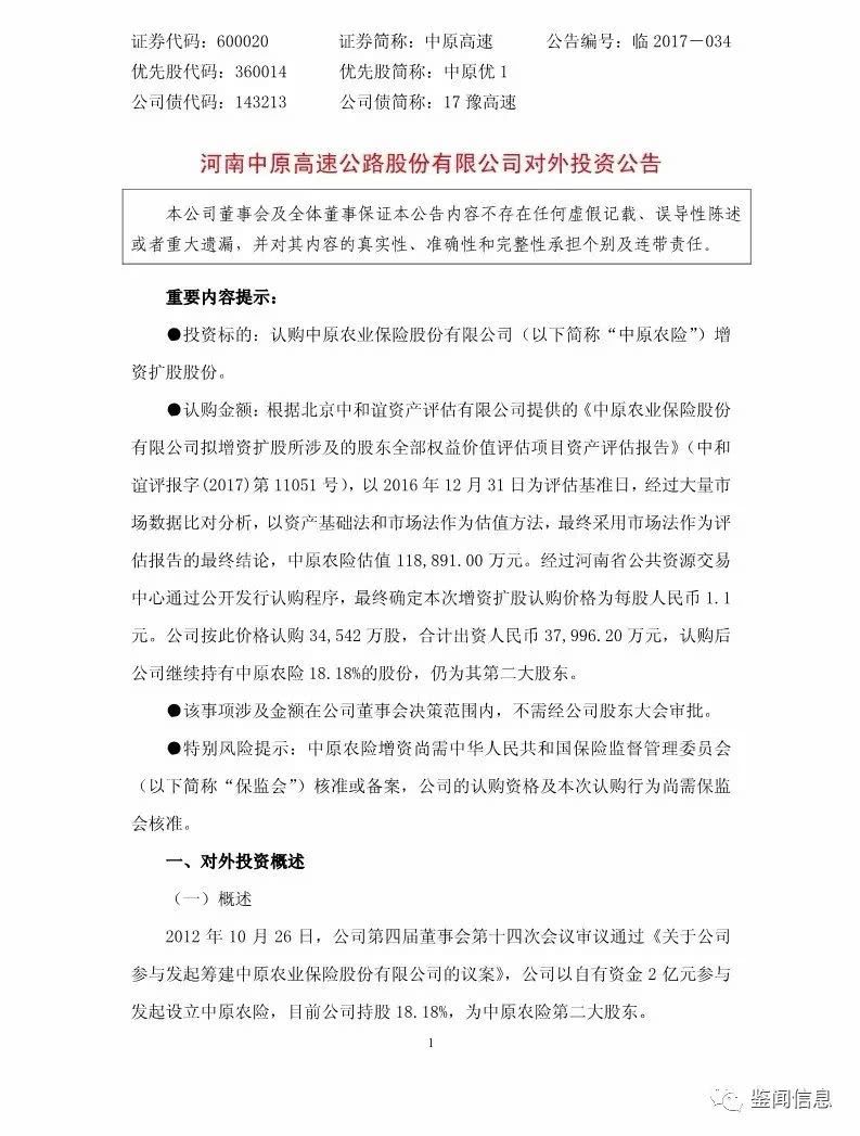 中原高速今日晚公告显示,公司利用自有资金,按发行价格1.1元/股认购34542万股,合计出资人民币37996.20万元,认购后公司继续持有中原农险18.18%的股份,仍为其第二大股东。(公告全文附后)