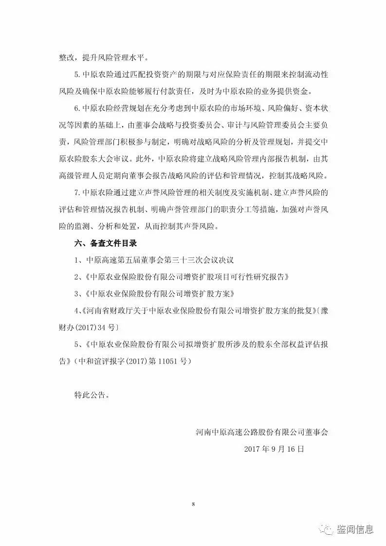 中原高速公告显示,《股份认购协议书》将由各方履行完内部决策后签订,待中原农险股东大会批准本次股票发行方案后生效。中原农险根据保监会要求,将相关材料报保监会核准或备案。公司将及时披露进展情况。