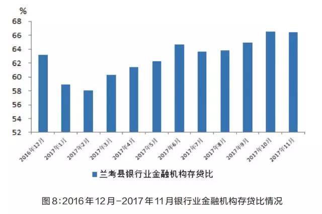 3.存贷比状况改善,信贷结构明显优化。11月末,兰考县银行业金融机构存贷比66.5%,较年初提高3.2个百分点,其中新增存贷比80.8%;涉农贷款余额124.29亿元,同比增长42.9%,高于各项贷款增速2.3个百分点,占各项贷款比重82.1%;小微企业贷款余额47.88亿元,同比增长41.8%,高于各项贷款增速1.2个百分点,占各项贷款比重31.6%。