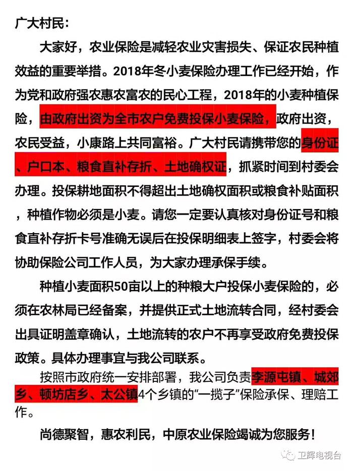 政府出资投保,让农户真正受益,昨天开始我市由政府扶贫办牵头2018年冬小麦保险办理工作已经开始,作为党和政府强农惠农富农的民心工程,2018年的小麦种植保险,由政府出资为全市农户免费投保小麦保险,政府出资,农民受益,切实保障农民的收益。
