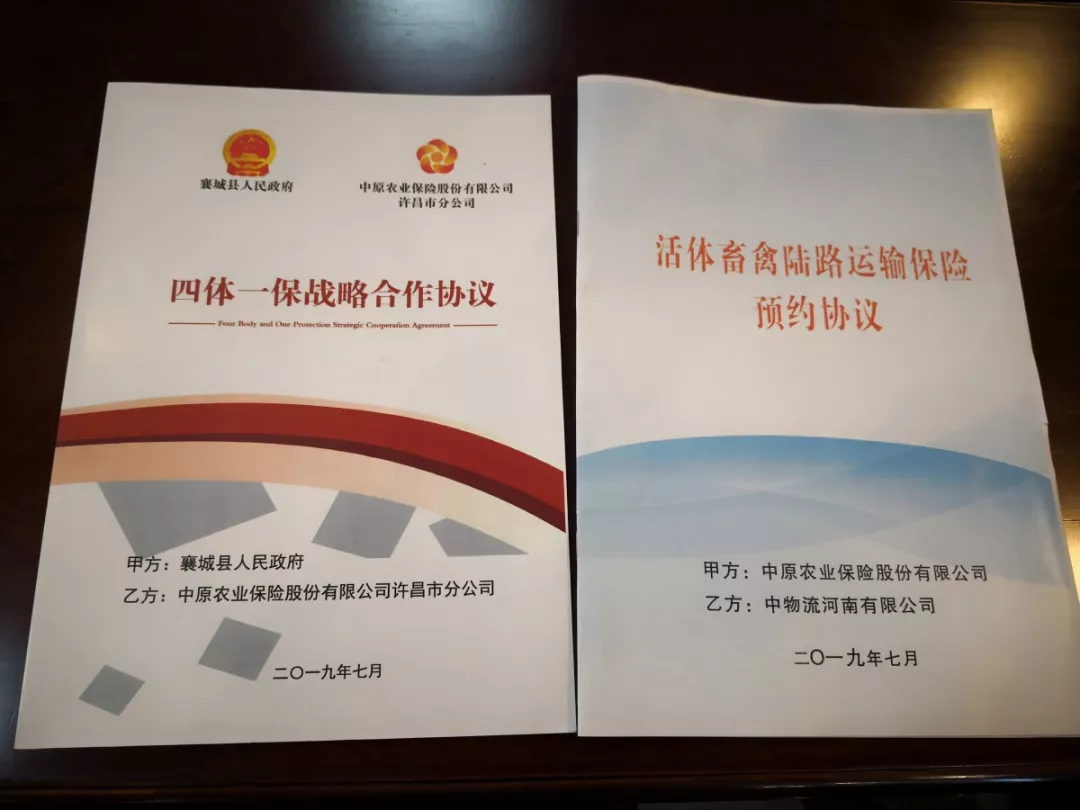 2019年7月3日,中原农业保险及相关单位共同打造的“四体一保”项目畜牧产业融合发展模式启动仪式在襄城县召开,意味着以全面促进畜牧业高质量融合发展的新模式正式落地。河南省财政厅、省畜牧局、襄城县人民政府、中原农业保险股份有限公司、“四体一保”项目团队等单位参加仪式,共同推动“四体一保”项目在襄城试点落地,生猪线上交易全国第一单、活体运输保险全国第一单均在仪式上成功签约。