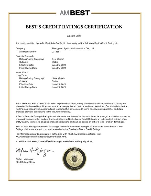 A.M.BEST作为国际四大信用评级机构之一,其授予的评级结果在国际和国内保险市场具有很高的认可度。中原农险作为河南省成立的第一家保险法人机构,也是国内少数专业型农业保险公司之一,获评的“B++”是该级别中最高等次。评级结果全方位展现了公司良好的业务状况、稳健的风险管控能力等综合实力。